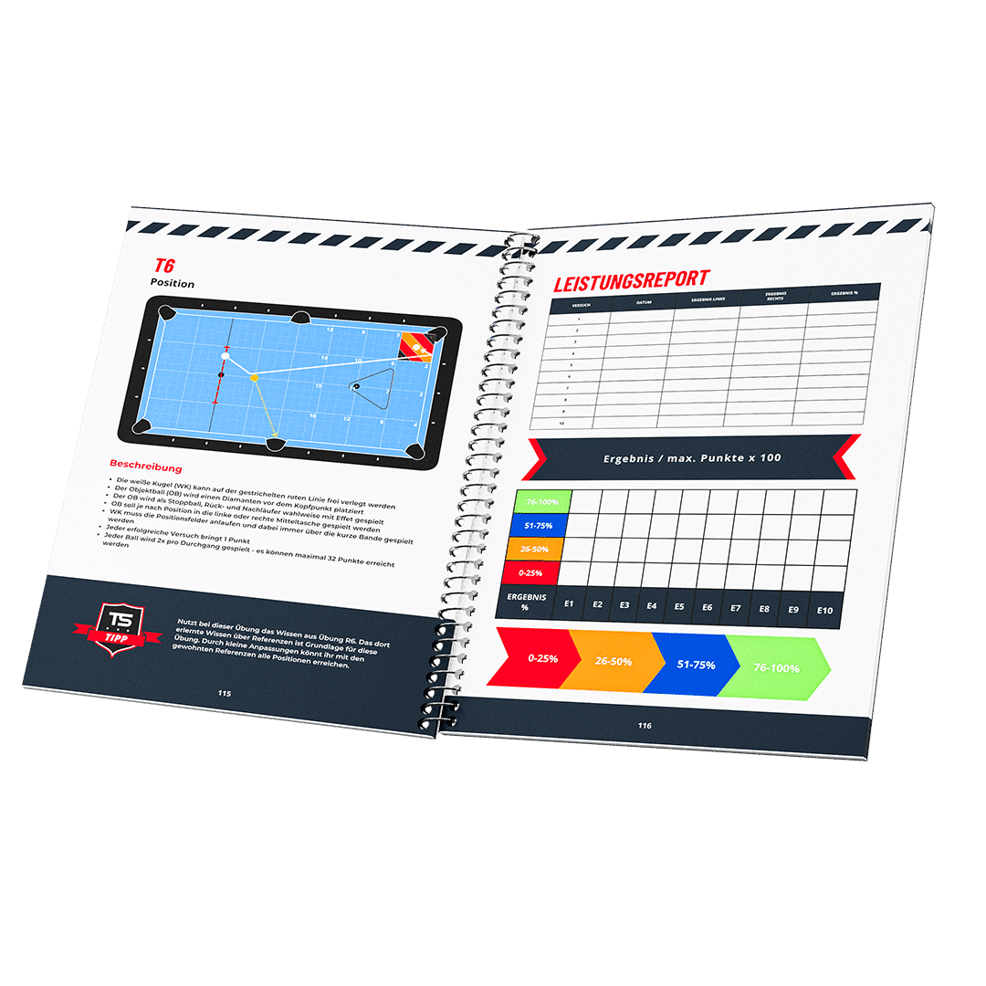 The training book – CONCEPT PRACTICE SYSTEM BASICS is a real treasure trove of basics for ambitious billiard training. The predetermined structure helps to teach the basics of pool billiards in a simple and understandable way. It is suitable for all players who want to improve or learn the basics. Numerous exercises, explanations and detailed instructions with THE-STROKE tool slides are shown on 128 pages.